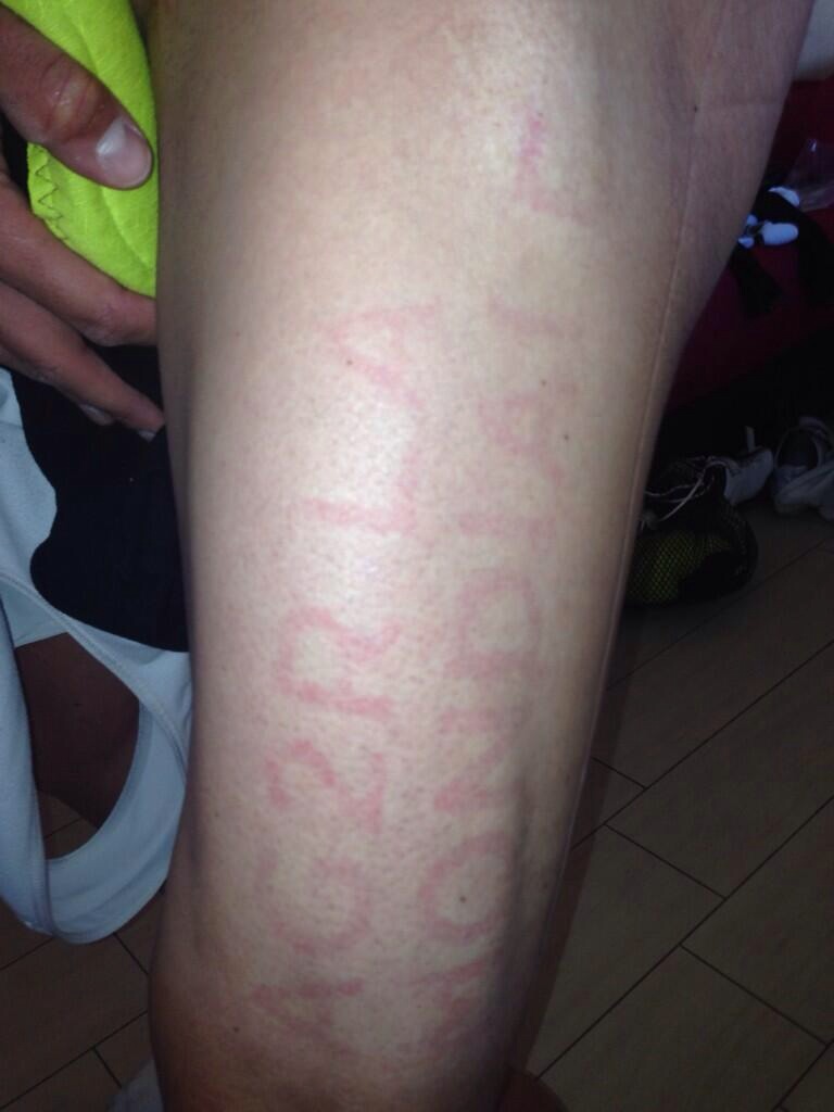 Firstly Samuel Dumoulin of AG2R tweeted an image of his own alabaster thigh marked with the lettering of his team name in an uncomfortable-looking pink tinge.