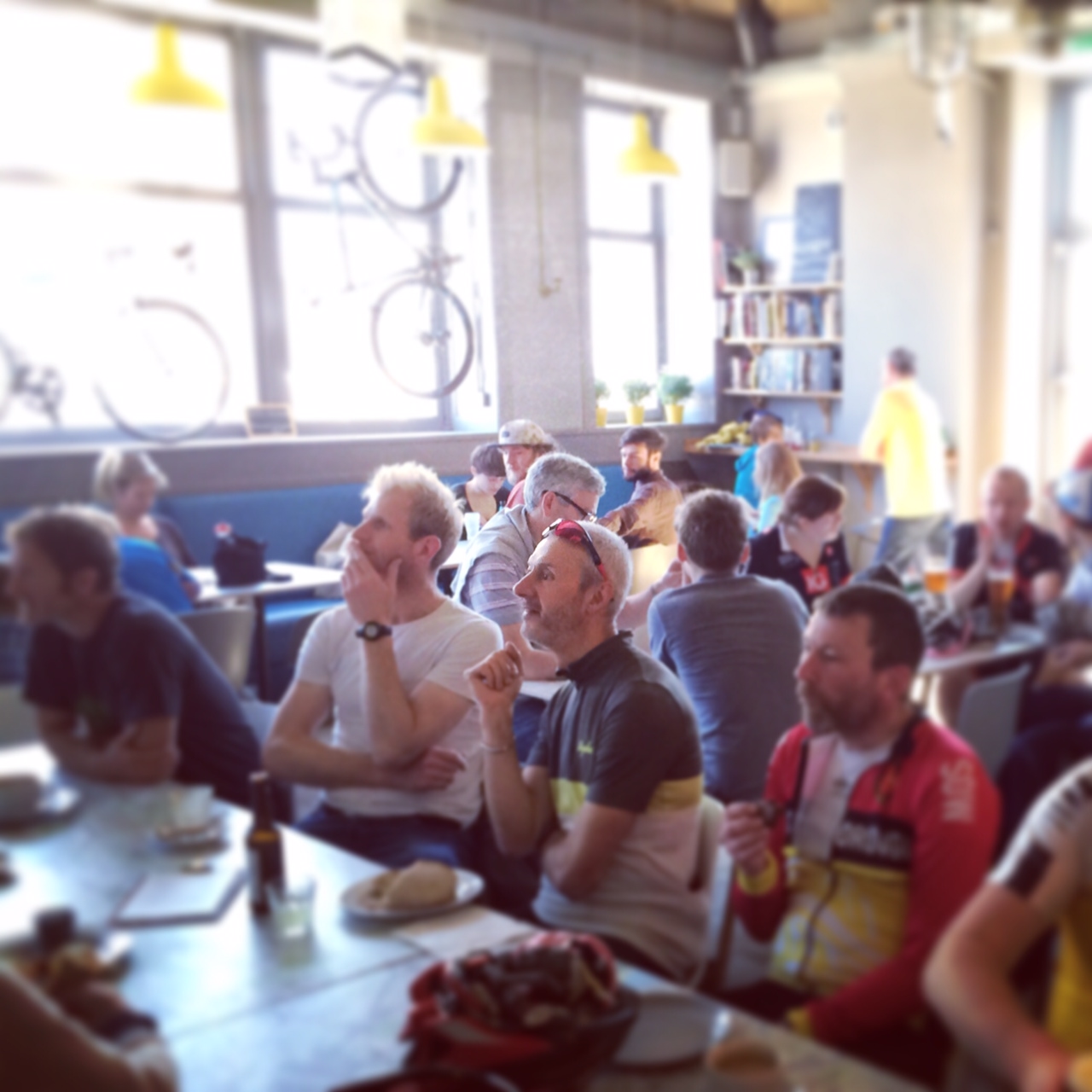 Despite being brand new, there was no hint of awkwardness in evidence amongst the staff or customers and the cafe buzzed with an ease-inducing atmosphere. The large, communal main tables and lightly industrial decor lend a welcome informality to the place. The mix of various chairs and banquette seating also set the relaxed tone straightaway. As some of the Sunday cyclists moved off to finish their ride we eventually bagged a smaller table beneath one of the bikes hanging in the main window – a Ritte with a striking paint job – and settled in for the afternoon. Our two boys were quick to spot the day’s free WiFi password – a nod towards Bradley Wiggins’ most famous year – and settled down to amuse themselves until Roubaix really hotted up. They re-surfaced a couple of times with requests for frites, sausage sandwiches or apple juice but were quickly at home in what is a pretty child-friendly venue.