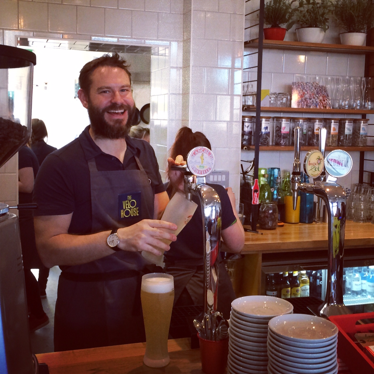 We drove down from Blackheath after cheering on the London marathon runners leaving Greenwich Park on their long, hard journeys around the capital. Having spent the last few months following owner Olly Stevens’ own long, hard journey towards this moment, it was hugely gratifying to walk through the doors a little after noon and not be able to find a free table to sit at. The ground floor cafe, bathed in beautiful sunshine, was packed to the exposed concrete beam ceiling with lycra-clad cyclists, coffee-loving couples and a fair few family groups. Olly, manning the cafe’s bar, with a large team of helpers in the kitchen all decked out in their new VeloHouse uniforms by Vulpine, looked to be in his element.