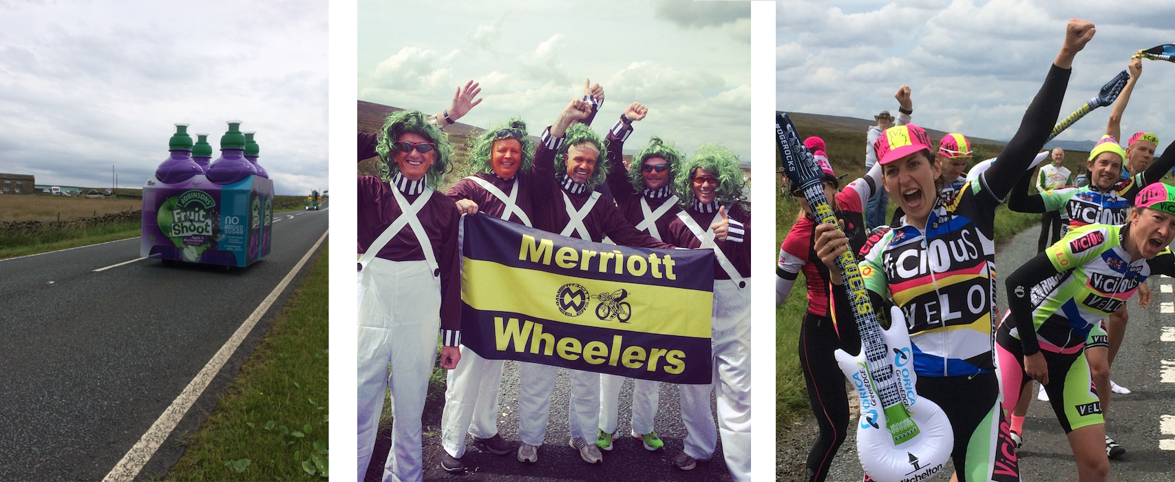 The roadsides thickened again at the top of the Category 4 rated climb and we ended up back-tracking a couple of hundred yards for a clear view on a favourable bend. We chose our viewing companions well enough to warrant a TV spot by placing ourselves between a group of day-glo punk lycra’d girls from Vicious Velo and eight orange-faced Oompa-Loompa’s from Krewkerne in Somerset but a crash in the bunch meant that we missed out. It did mean that we got an close-up look at Tejay Van Garderen though as he stopped opposite to grab a wheel from a teamate before speeding off after the peloton.
