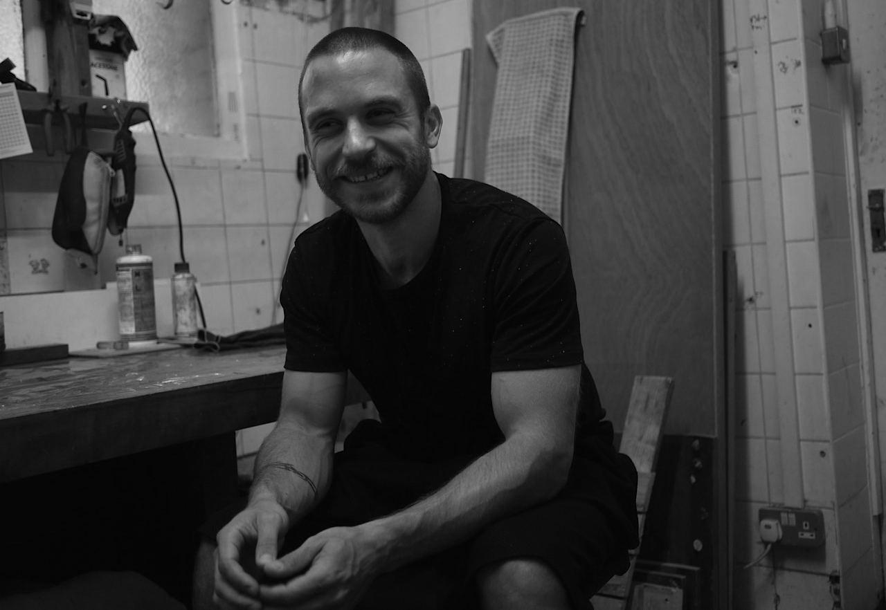I recently met up with Ed at his workshop in East Hackney to see his unique frames up close again and hear his story firsthand. As I arrive the owners of another workshop unit are busying themselves with power tools and paint on some large set-building project in the communal courtyard outside. Not having visited before I ask a lady using a jigsaw if she knows where Ed’s space is. Somewhat disconcertingly she says she doesn’t know an Ed. “I am here.” says a voice behind me, where a young looking man in his late twenties is sitting on a bench playing with a small black dog. As we greet each other Jigsaw Lady also uses the opportunity for an introduction to him before we walk through to his workshop inside. I ask when he moved in, working on the assumption that as people don’t know him that he is newly arrived. “About nine months ago” he says, wobbling a flat hand to indicate uncertainly. “You like tea?”
