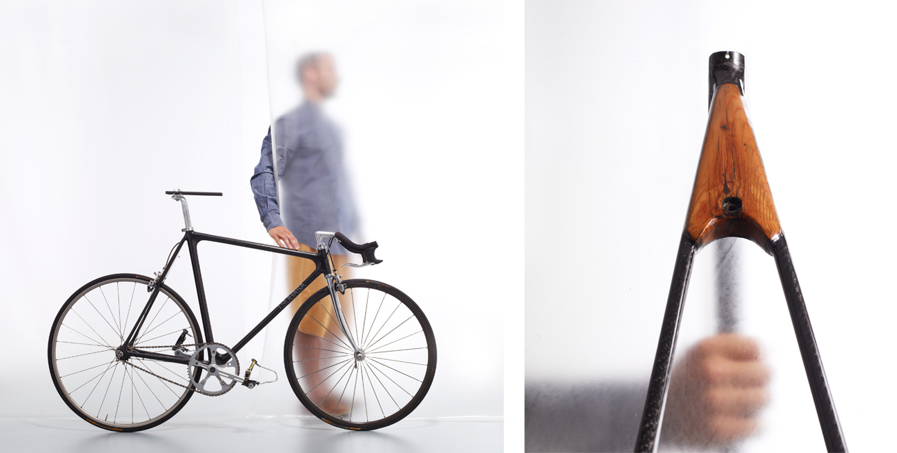 I’ve put a few bikes together in my time and I have a yearning to find some time to go on a frame-building course but it has never occurred to me to begin building carbon-fibre bikes from scratch at home. That’s what Ed did. And even then he rejected most of the wisdom that he found and developed something new which addressed what he perceived as one of the main issues with carbon fibre. Over the course of nine months, as he and his Japanese wife Noe – who he met at Central St Martins – fixed up their new home during the day, he starting making what became a low-profile carbon monocoque in the evenings and weekends. “In the bath tub.” he recalls with a grin. He named the finished frame the Tsubasa T-01, using the Japanese word for ‘Wing’ as a nod to his relationship with his wife and her support of his new interest, and integrated a piece of the timber flooring from their old flat into the seat stay cluster as a gesture of the personal journey they were undertaking at the time. “It’s an interesting visual conversation,” he says of the difference between the carbon and the timber.