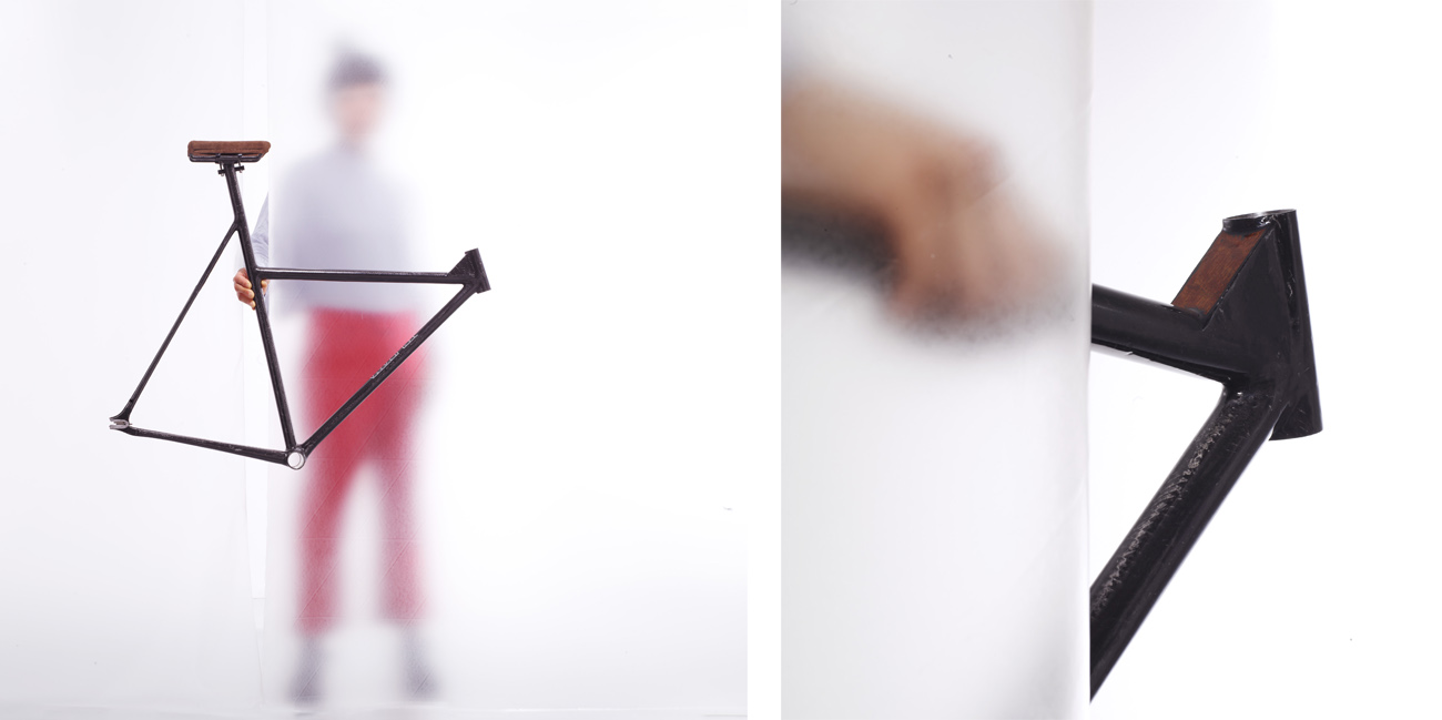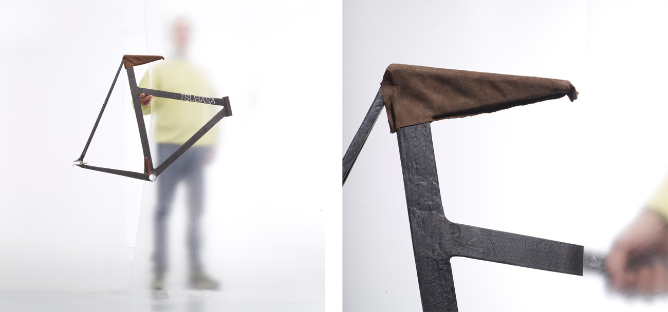 Heart played a big role in Ed’s next frame. The T-02 ‘Miss Noe’ single speed setup was built for his wife with a small front triangle and lowered top tube to help her stand with both legs on the floor when stopping often in the city. Timber from her first family home was again brought into the frame and an unusual split seat sits atop the integrated seatpost. Ed describes his bikes as ‘spirit built, not custom built’. The frames seek to reflect the inner spiritual character of the rider as well as the outer, physical attributes. It’s a beautifully appealing sentiment and a world away from the stock joke of couples in matching cycling gear riding matching bikes. I don’t know Noe but just by seeing her bike frame I know I would find a engaging, interesting person who I would want to get to know better. It’s not a bad sales pitch. An artist, her presence is felt in each of the tweaked Tsubasa headbadges that are modified for each frame and in the beautifully considered marketing material that they are slowly creating to back the frame designs.
