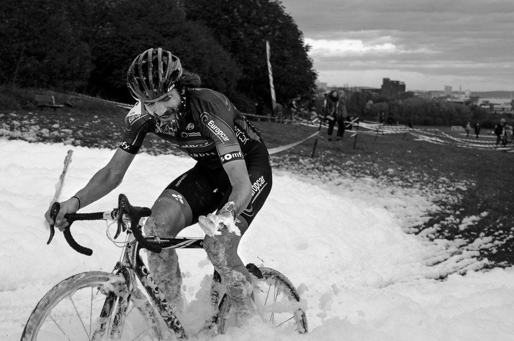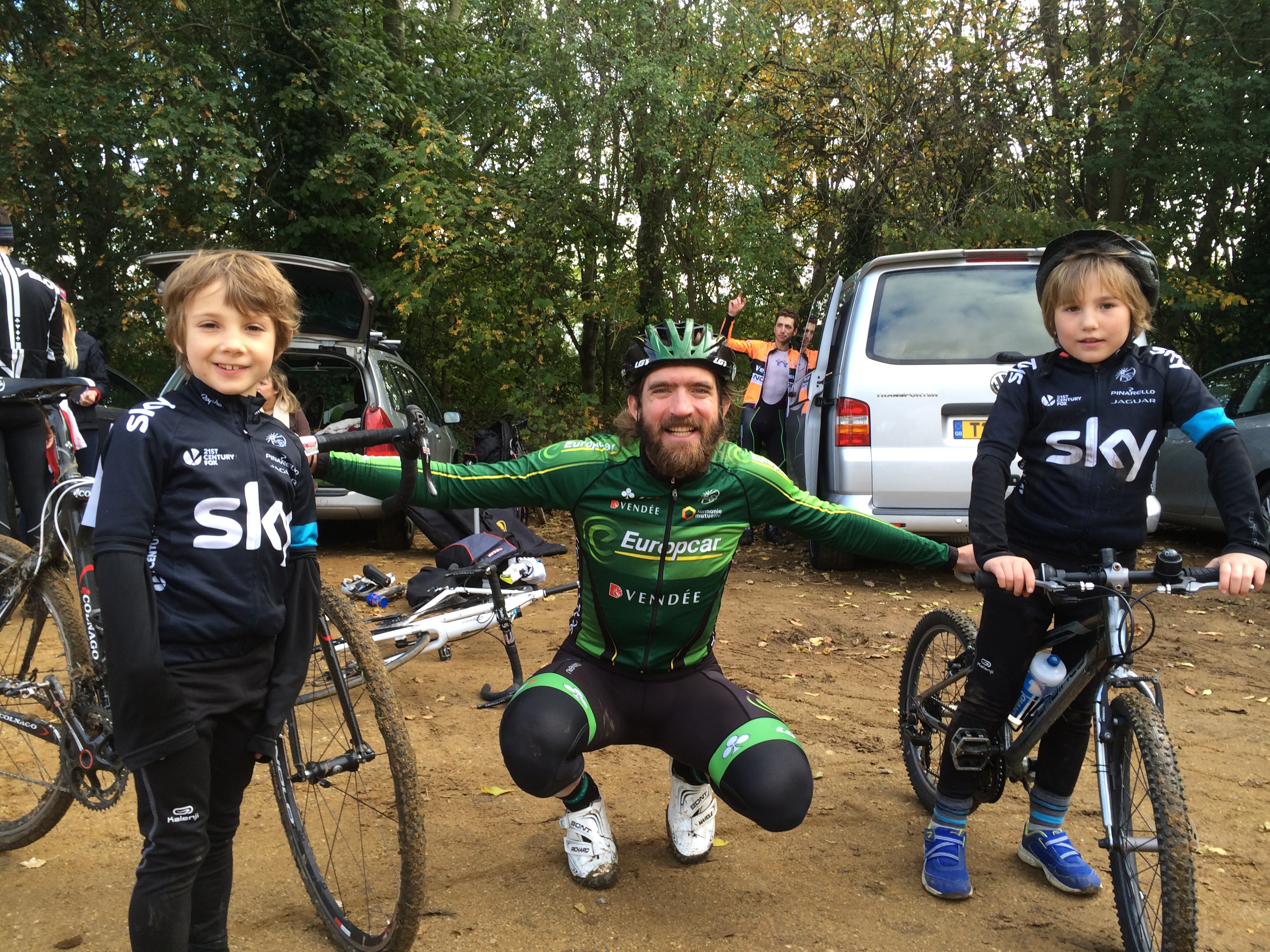 There are always more than a few familiar faces at Supercross but it was definitely unexpected to see @DanFromNam, Dan Craven, the bearded Europcar pro road rider, hanging around the elite teams vans. Even more unexpected to see him in cycling kit toting a Colnago cross bike. It turns out that he has always wanted to ride at Supercross and he was Rapha’s guest for the day. “How many cross races have you done before?” I inquired. “None” he replied with a anxious rub-down of the famous beard, “This will be my first. I’ve always wanted to do it but I thought I was doing the tequila and foam one. I’ve never ridden cross before and they told me yesterday that I’m riding with the Elites. I’m going to come last..”. My pint-sized eight year old piped up in response, keen to get one over the pro he had watched in the recent Vuelta, “”I’ve done three.” he said proudly. “And so has he” he continued, pointing at his half-pint brother. Dan smiled politely but stopped short of asking them for race advice. Just as well really, they hadn’t given me even the slightest hint about the best lines, suitable tyre pressure or the state of the parcours. Honestly, anyone would think they were just here for the fun of it. He did generously give them a quick geography lesson about Namibia before going back to his preparation.