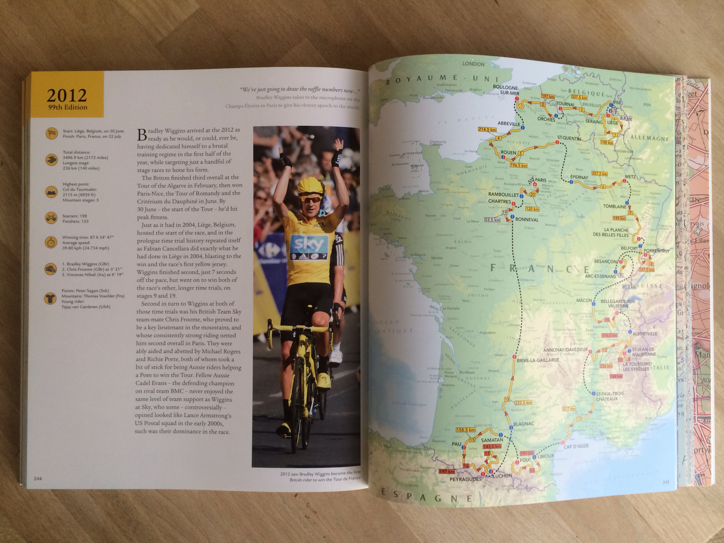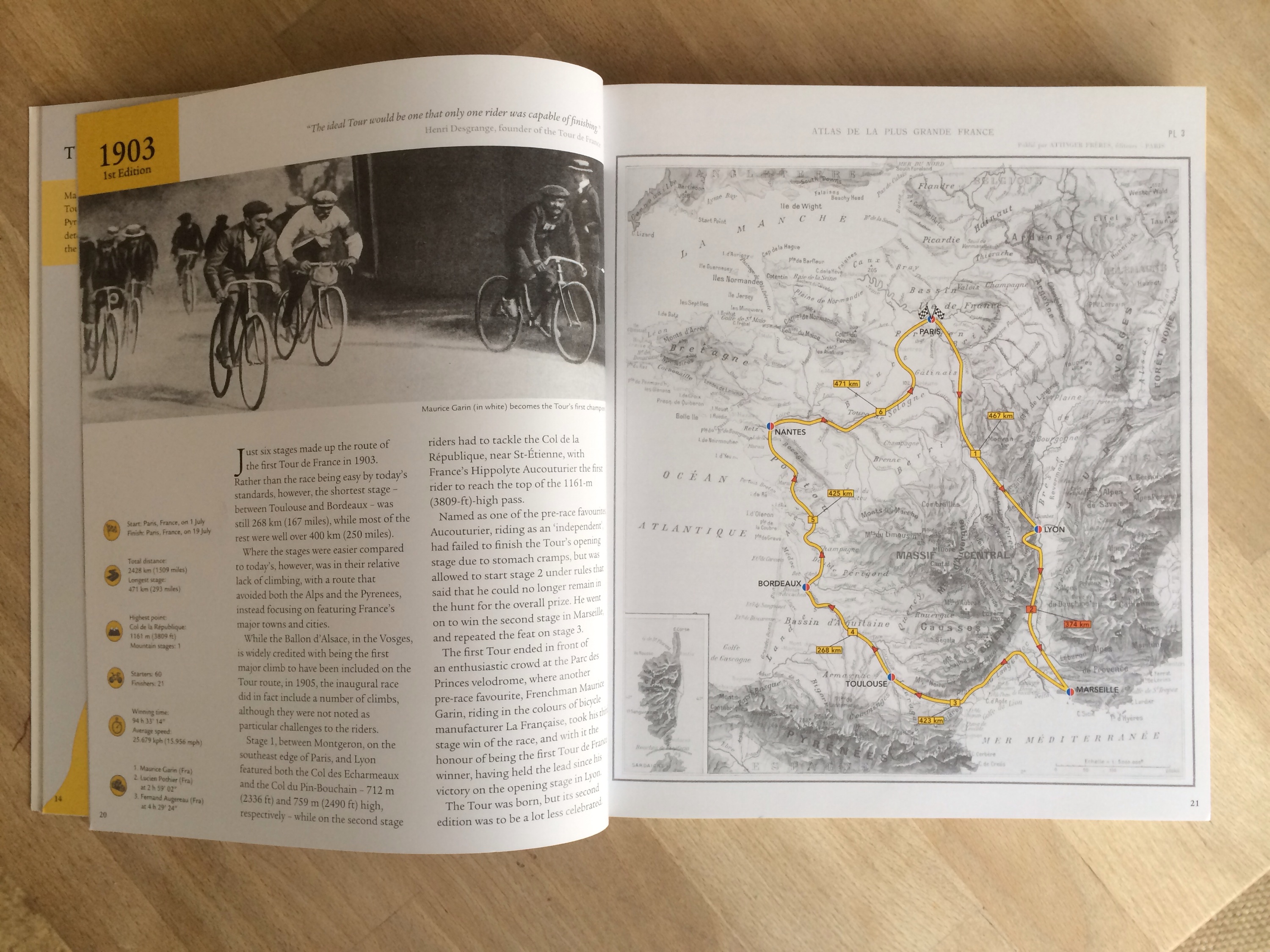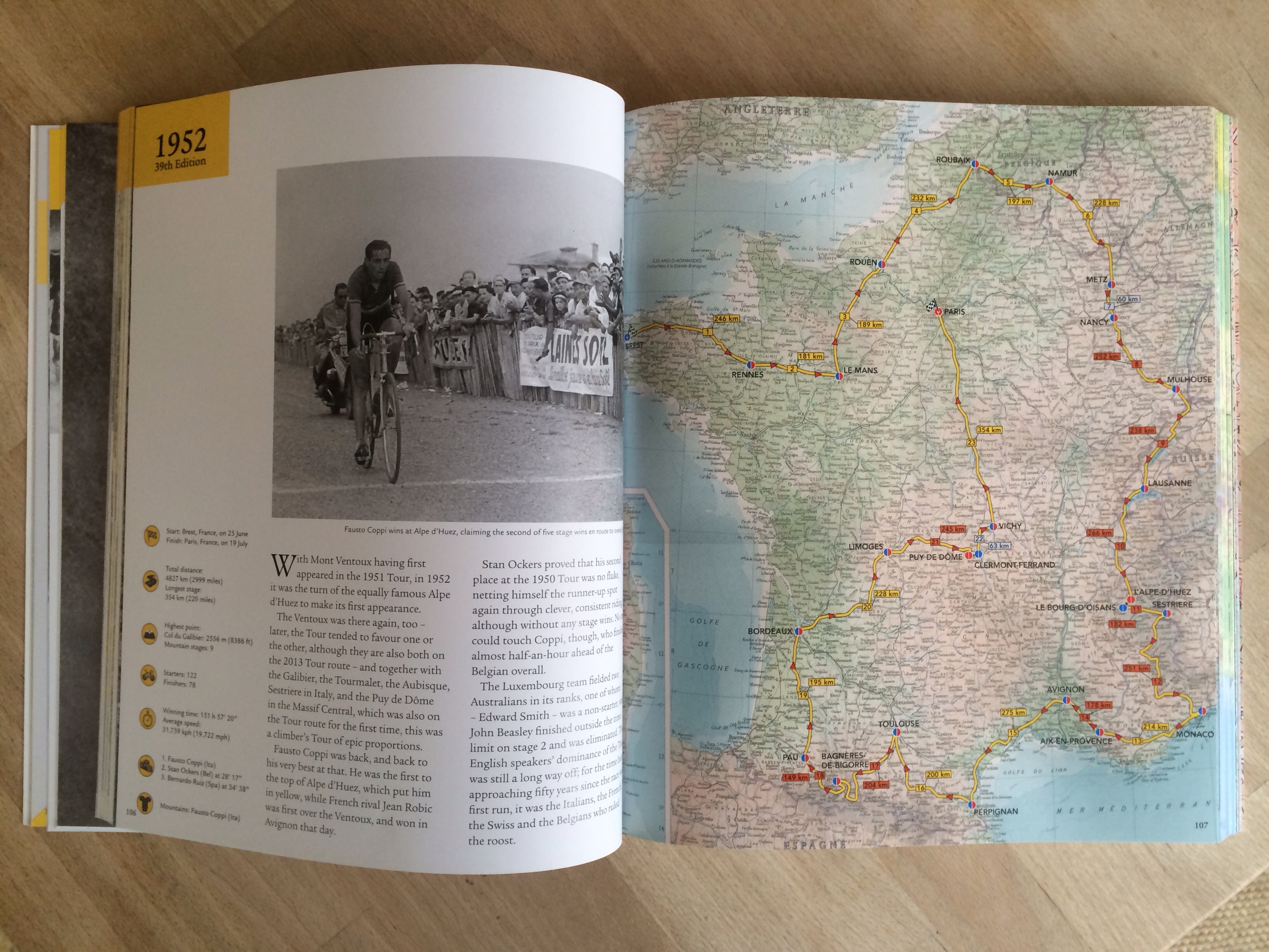 Hovering neatly between a beautiful (but never read) coffee table tome and an indispensable (but dog-eared) reference book, Mapping Le Tour is something approaching all things to all men. The layout is simple and effective: chronologically ordered Tours have a map on the right hand page with a précis of the action and the main statistics on the left.