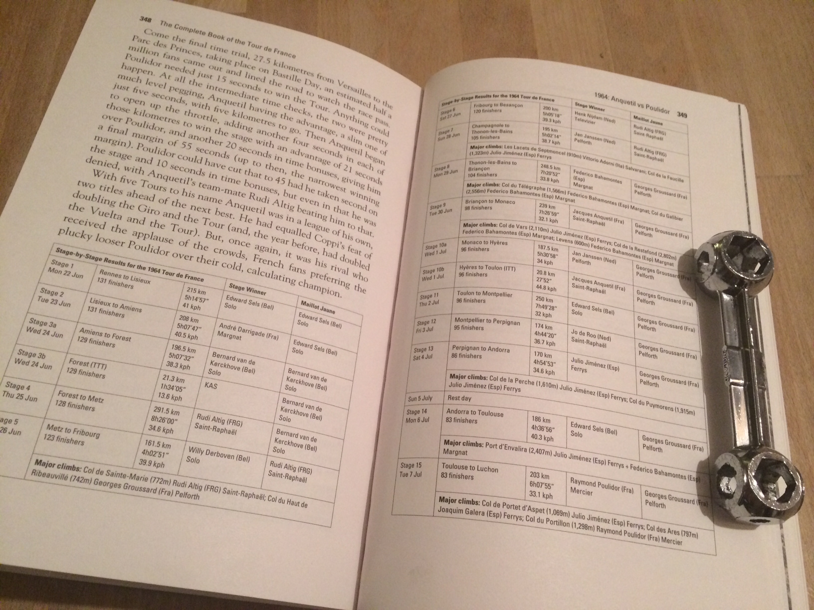 So, where to begin? Not necessarily at the beginning. McKay has naturally arranged his book in chronological order (and consumed that way the accompanying narratives would build to give a comprehensive – and comprehensible – understanding of the Tour’s progress through the decades) but one of the real joys of an almanac is that you don’t need to devour it in any particular order. In fact, there is a strong case for saying that you should never actually read it at all. Instead you should either consult it for a particular reason (just who was the Lanterne Rouge in 1937?) or you should just browse in order to allow it to reveal it’s secrets to you in a random, chance-like fashion by flipping pages until a word or name catches your eye. Anquetil, Aucouturier, Alpe D’Huez; Pottier, Pantani, Puy de Dome; Garin, Gimondi, Galibier… It’s an Aladdin’s Cave of Tour History, Tour Geography, Tour Science and Tour Politics. All you have to do is walk in..