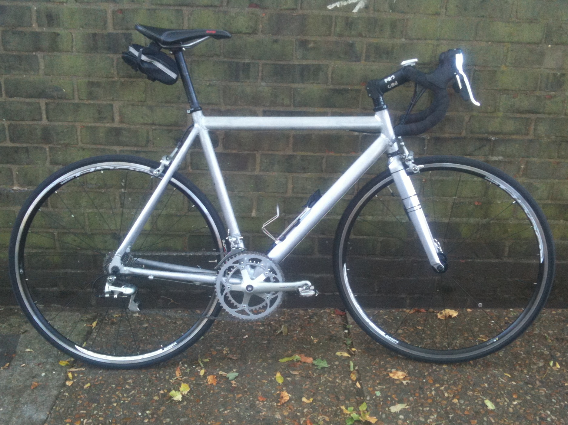 14. Corvino Road bike. LFGSS frame and a load of parts. Stripped it to bare aluminium. (Was stolen at the same time as the Langster. Saw it being ridden in Greenwich Park and took it back. Mrs TJP rides it now)